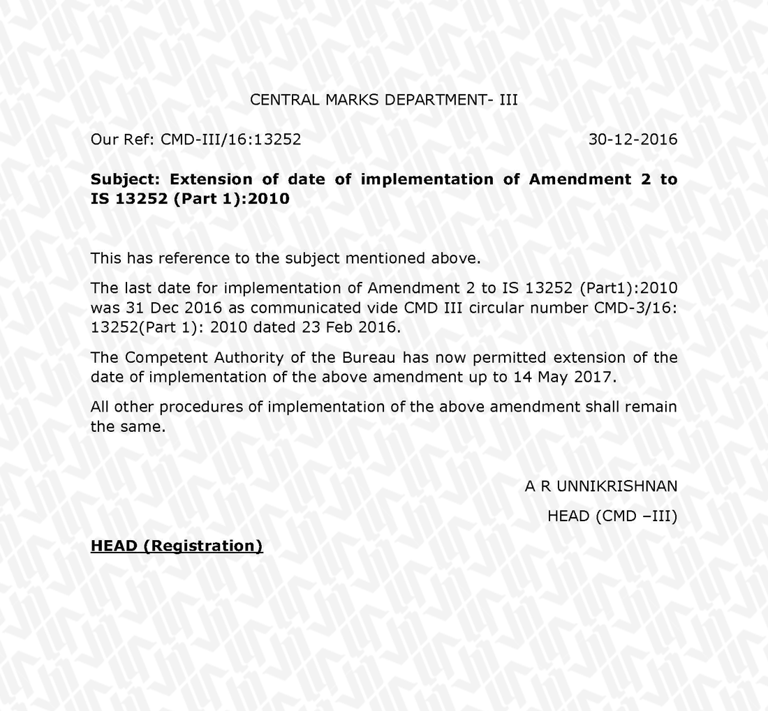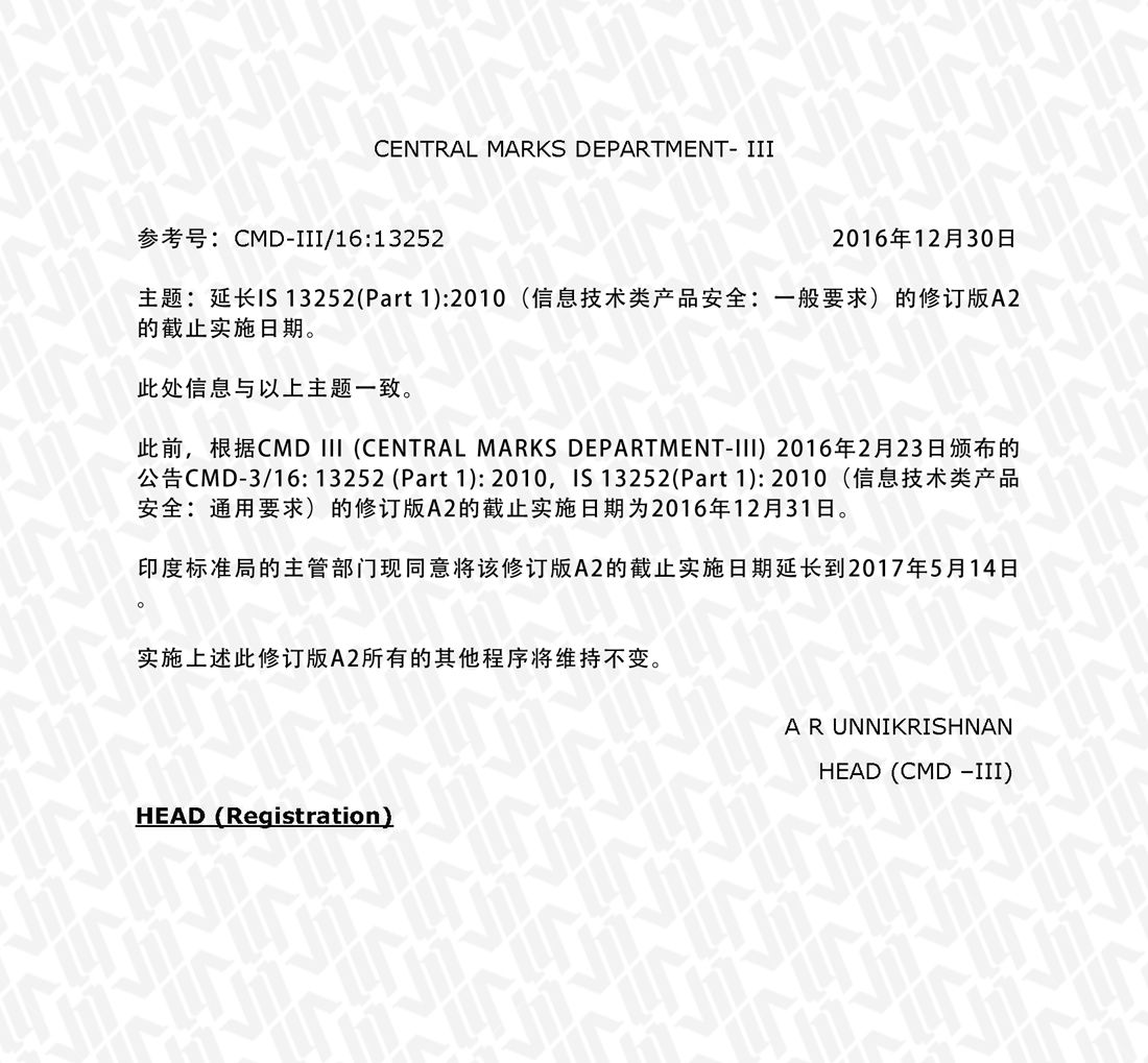 根据BIS于2016年12月30日发布的最新文件,CMD-3/16: 13252 (Part 1): 2010,IS 13252(Part 1):2010(信息技术类产品安全:通用要求)的修订版A2的截止实施日期将从2016年12月31日延长到2017年5月14日。详见以下原版公文与译文: